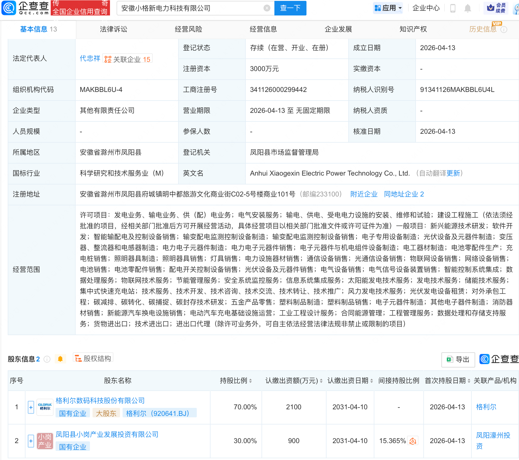 近日,安徽小格新电力科技有限公司成立,经营范围包含:物联网设备销售;储能技术服务;集中式快速充电站;碳减排、碳转化、碳捕捉、碳封存技术研发等。企查查股权穿透显示,该公司由格利尔(920641)等共同持股。