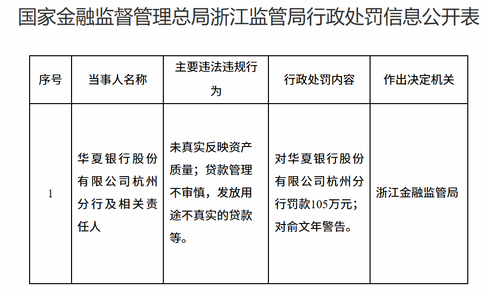 4月14日,国家金融监督管理总局浙江监管局行政处罚信息公开表显示,华夏银行股份有限公司杭州分行因未真实反映资产质量;贷款管理不审慎,发放用途不真实的贷款等被罚款105万元。责任人俞某年被警告。